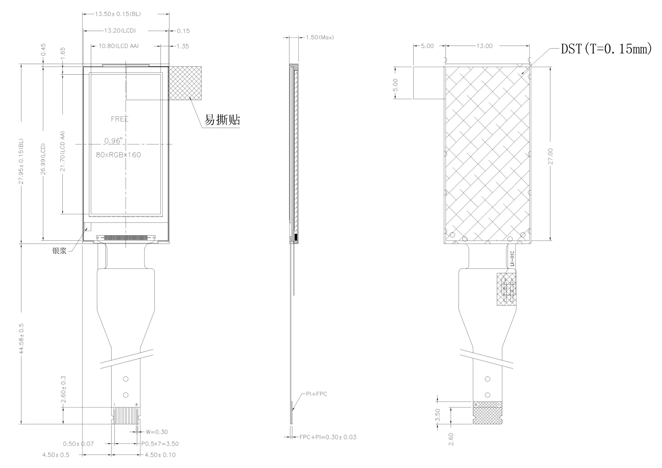 | LCM Dimension | 13.50(W)* 27.95(H) *1.50 (T) | mm |