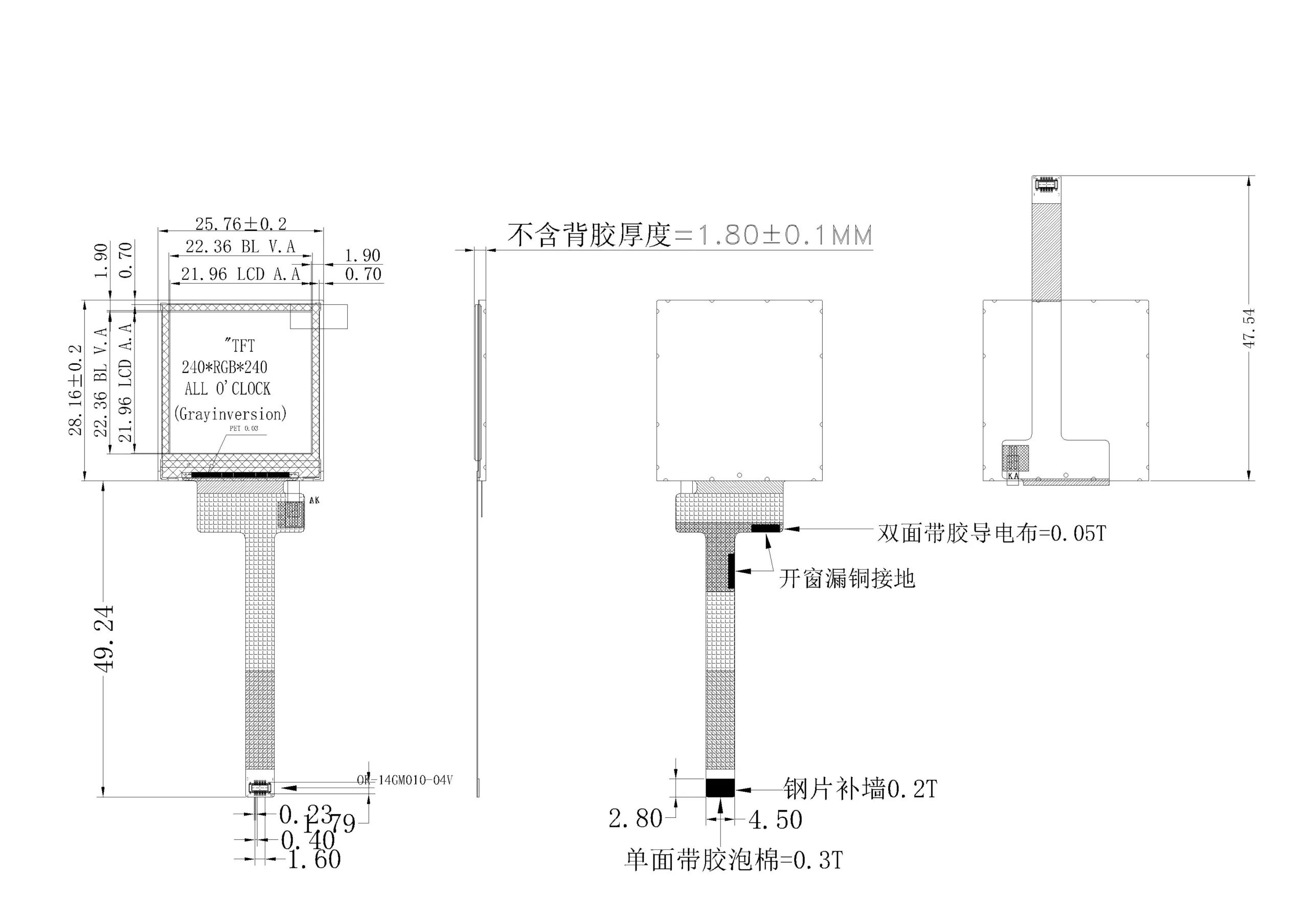 | LCM Dimension | 25.76(W)* 28.16(H) * 1.3+-0.1(T) | mm |