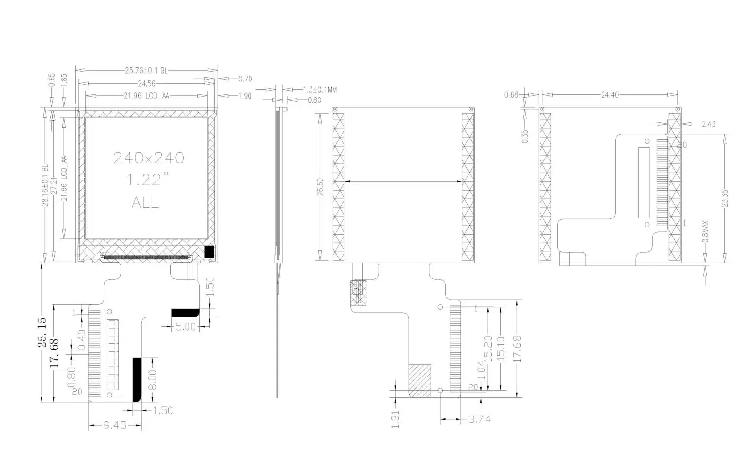 | LCM Dimension | 25.76(W)* 28.16(H) * 1.3+-0.1(T) | mm |